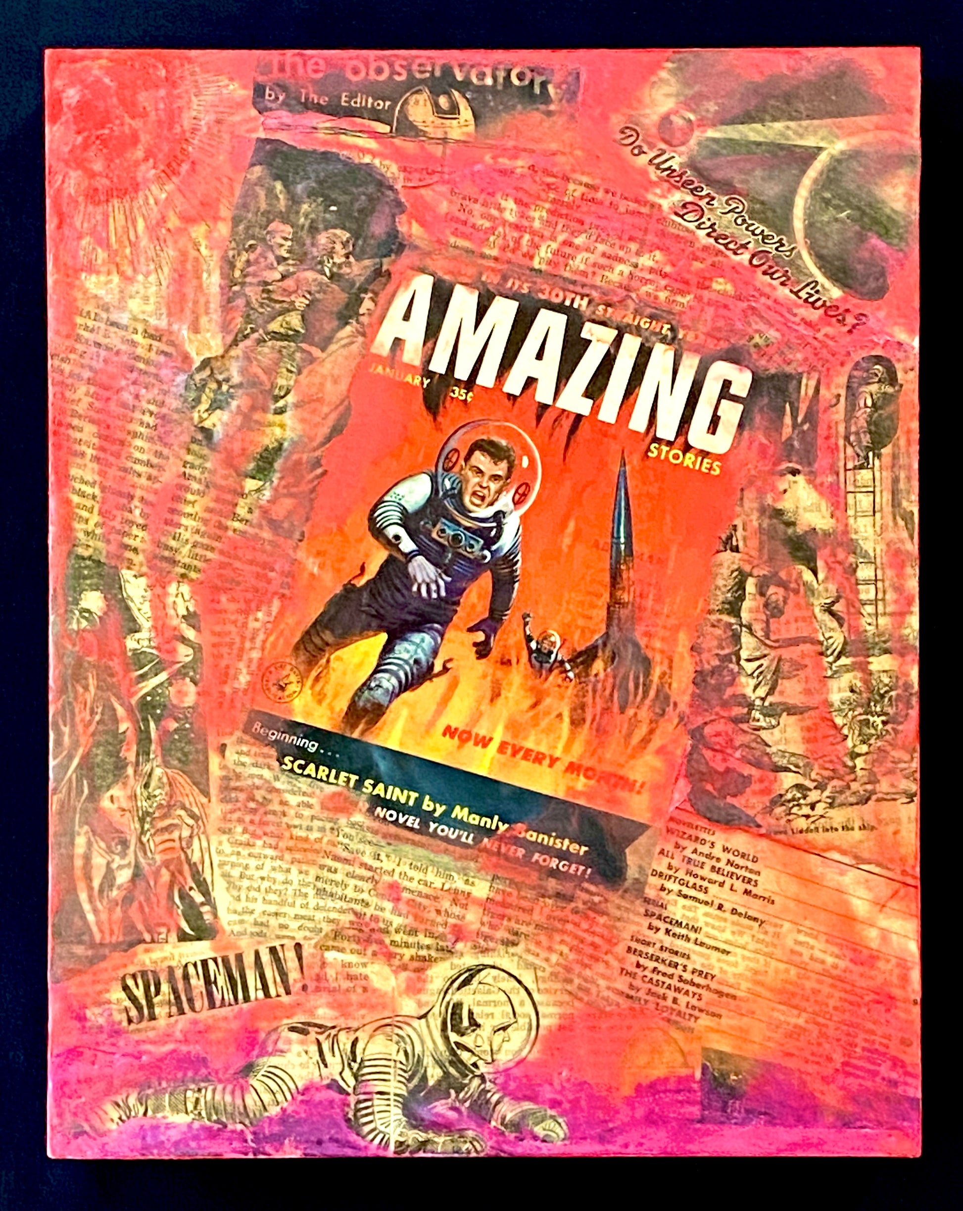 Vintage sci-fi pulp fiction book, melted beeswax, damar resin, mica powder, and oil pastel on cradled wood panel