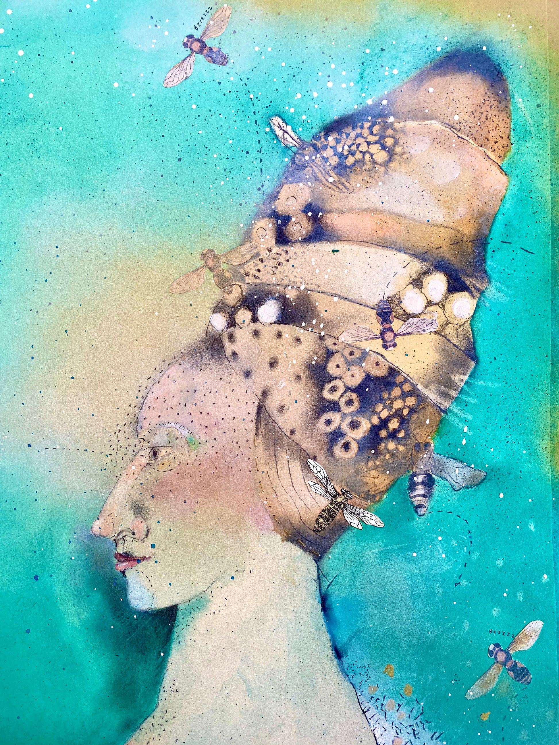 I primarily use watercolor and gauche to lay out the basic design of my work, and then I go back and develop the piece with pastels, pencils, gesso and whatever else is within my reach.