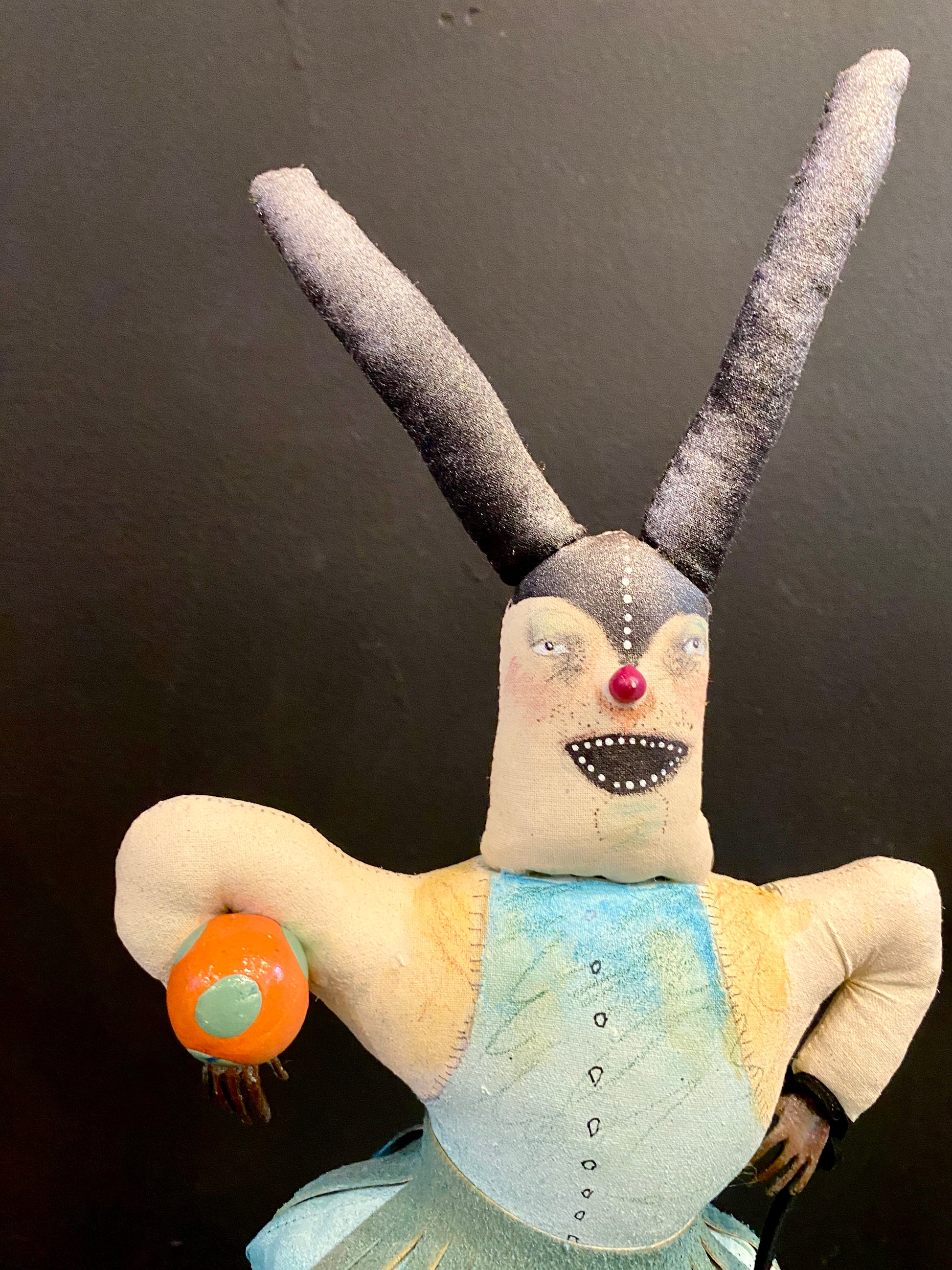 Hoola Wabbit Plays Ball with Little Woo Woo, handmade soft sculpture | Vicki Bruner