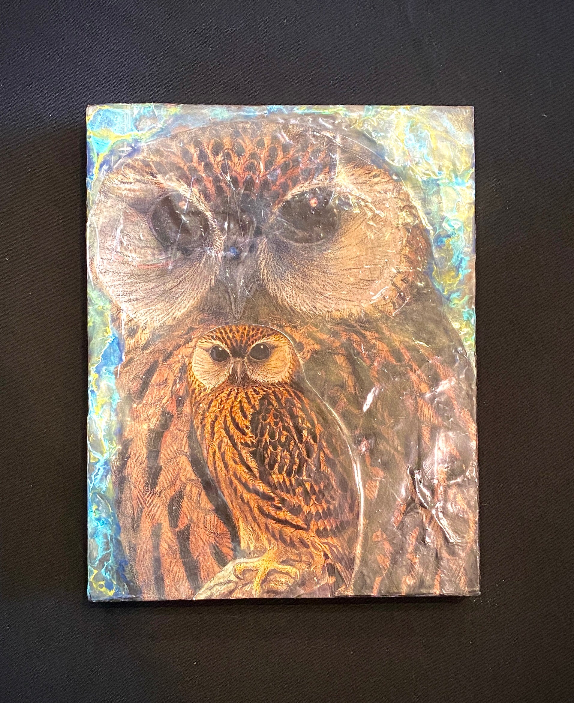 Handmade encaustic collage of vintage owl illustrations on wood panel